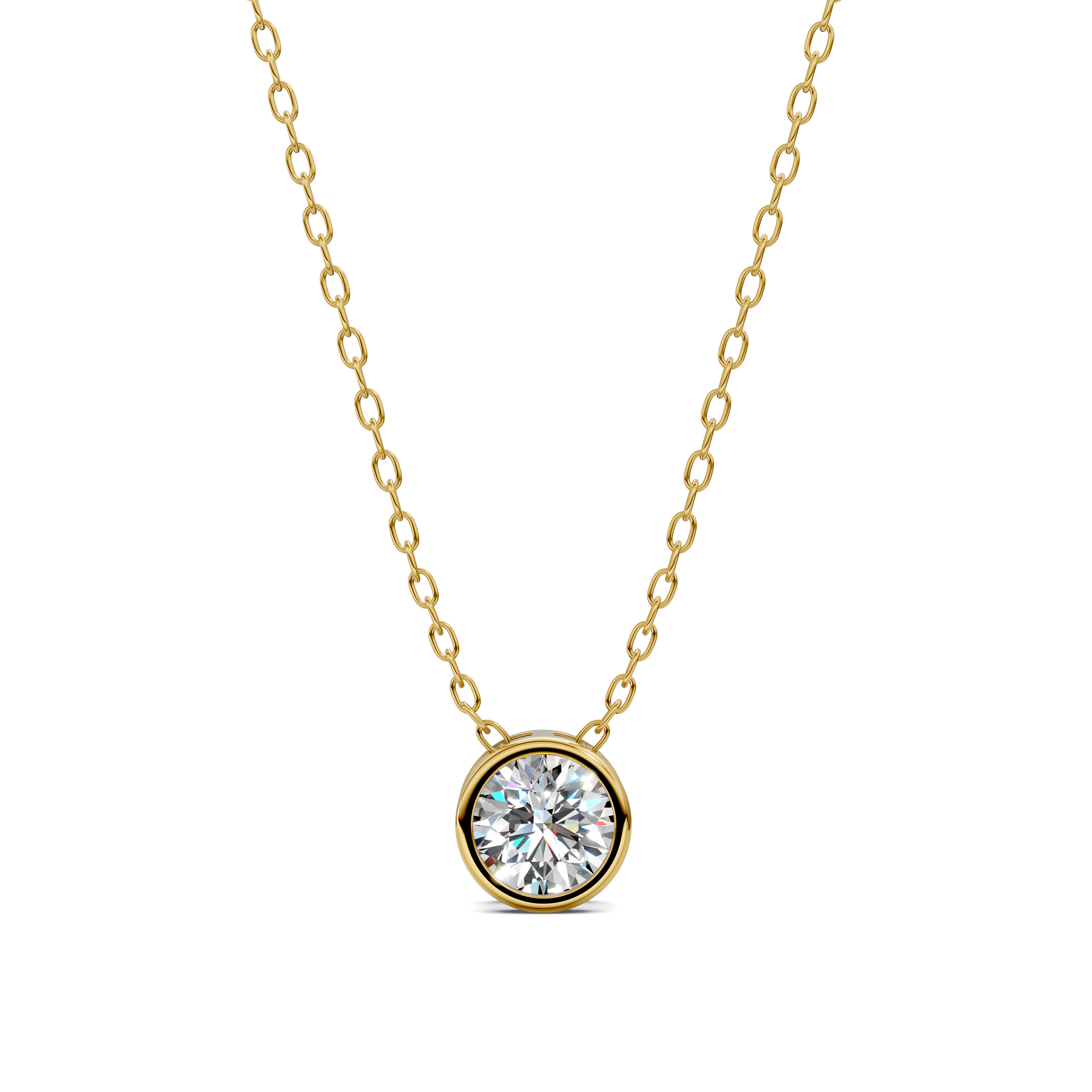 Bezel Solitaire Diamond Necklace features a refined, minimalist design crafted in gold. A brilliant lab-grown diamond is securely set in a sleek bezel, creating a clean silhouette with timeless appeal. Perfect for everyday wear or thoughtful gifting, this necklace adds understated elegance and effortless sparkle to any jewelry collection.